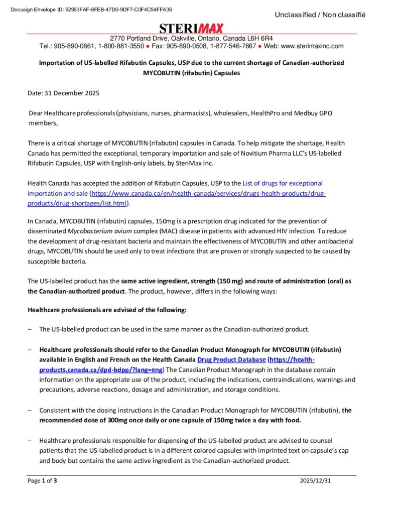 Importation of US-labelled Rifabutin Capsules, USP due to the current shortage of Canadian-authorized MYCOBUTIN (rifabutin) Capsules