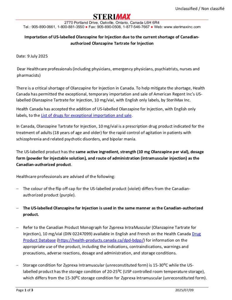 July 9, 2025 Importation of US-labelled Olanzapine for Injection due to the current shortage of Canadian-authorized Olanzapine Tartrate for Injection Download the full article (English) [...]